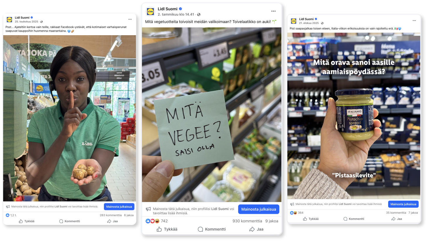 Ideat, konseptit, kuvat, videot, lyhytvideot ja copytekstit – me hoidamme kaiken aina ideantyngästä loppuraportointiin asti. Luodaan sisältöösi sellainen stopping power, että se taatusti pysäyttää nopeimmankin peukalon.