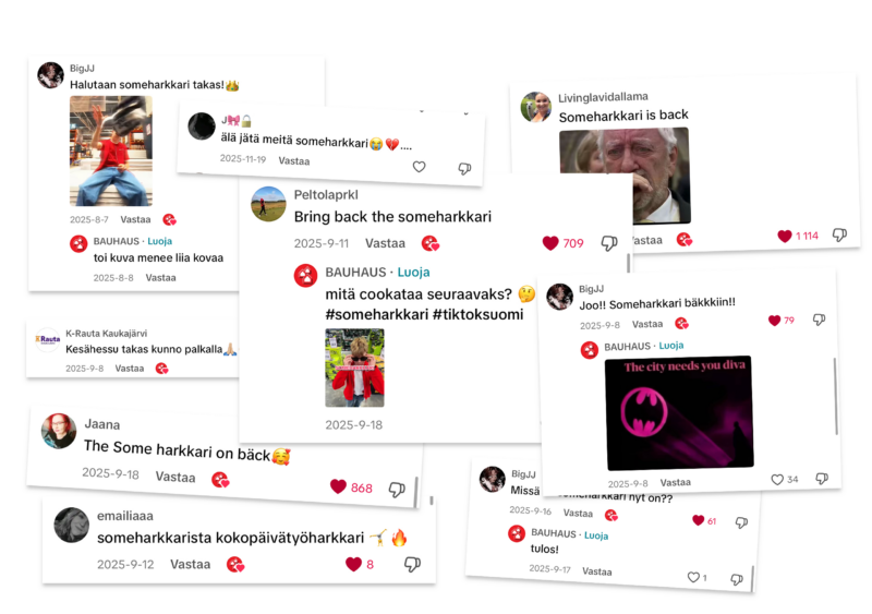 Someharkkari on teini-ikäinen kesätyöntekijä, joka on päätynyt töihin BAUHAUSin myymälään – ja saanut samalla vastuulleen yrityksen TikTok-tilin heinäkuun ajaksi. Hahmo yhdisti nuorelle yleisölle tunnistettavan kapinallisen asenteen ja epävarmuuden, samalla kun hieman vanhemmissa katsojissa hän herätti sympatiaa ja huumoria. Halusimme luoda illuusion, jossa someharkkarilla olisi vapaat kädet tehdä sisältöä täysin omalla tyylillään.