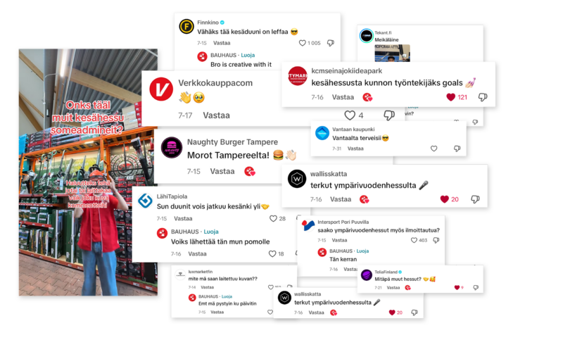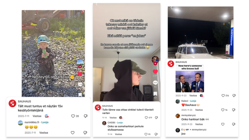 Yhdeksän julkaistun videon lisäksi hahmo vuorovaikutti laajasti TikTokissa myös muiden käyttäjien kommenttikentissä ja aktivoi yritystilejä synnyttäen todennäköisesti yhden Suomi-TikTokin vilkkaimmista kommenttikentistä yritystilien keskuudessa. Aktiivinen yhteisömanagerointi vahvisti mielikuvaa BAUHAUSista ketteränä ja somessa läsnä olevana brändinä. Unohtamatta tietenkään nippusidetempausta, jonka ansiosta someharkkari pelasti Backaksen kesän festarit.