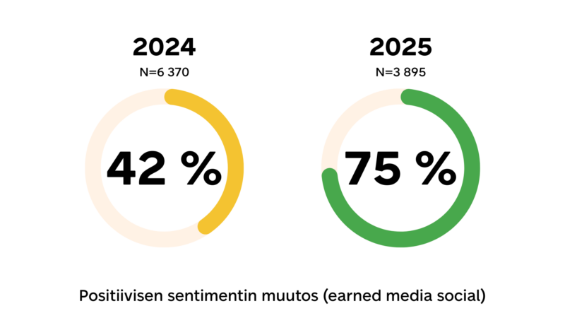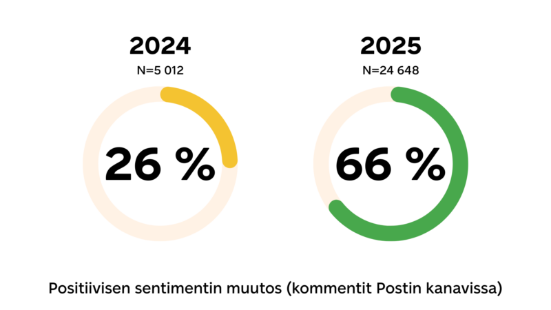Kommenttien sentimentti koki valtavan harppauksen ylöspäin ainoastaan vuodessa: omissa kanavissa positiivisten reaktioiden määrä lähes kolminkertaistui ja ansaituissa lähes tuplaantui. Samaan aikaan negatiivisten reaktioiden määrät laskivat. Sen lisäksi Postin työntekijät lähtivät aktiivisesti mukaan viestimään ja välittämään brändin sanomaa – LinkedIn oli selkeästi suosituin EGC-kanava, ja sieltä saadut osumat kasvoivatkin vuodessa lähes 33 %. Tämä toi näkyvyyttä myös ansaitun median kautta, vahvisti brändin inhimillisyyttä ja lisäsi yleisön sitoutumista – sekä tuki Postin asemaa läsnä olevana ja luotettavana toimijana sosiaalisessa mediassa.