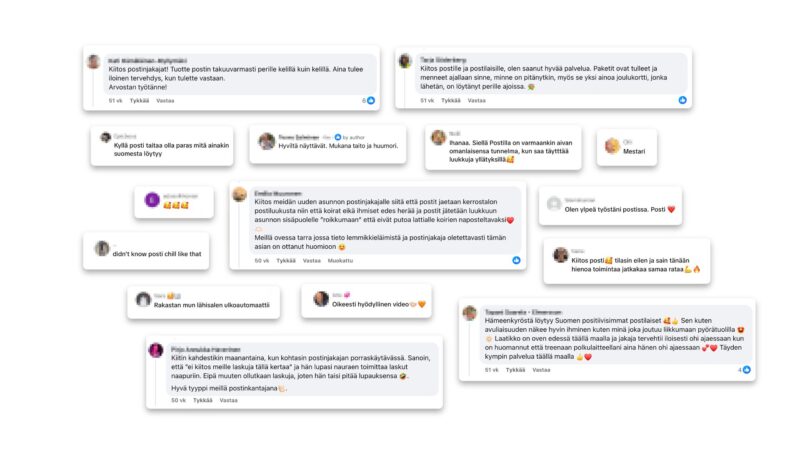 Ja aina, kun aihetta ilmeni, hakeuduimme myös aktiivisesti käyttäjien kommenttikenttiin välittämään hyvää mieltä ja vastailemaan kysymyksiin. Näin Posti ei olisi brändi, joka ainoastaan julkaisee sisältöjä, vaan läsnäoleva ja inhimillinen toimija, joka kohtaa ihmiset heidän omissa sisällöissään ja osallistuu keskusteluun aktiivisesti. Tämä vuorovaikutteinen läsnäolo auttoi kääntämään keskustelun sävyä ja vahvistamaan brändin välittävää mielikuvaa kokonaisvaltaisesti.